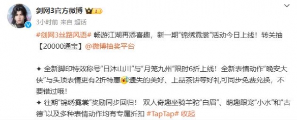 1、全新脚印特效称号“日沐山川”与“月笼九州”已正式上线,售价限时6折;
