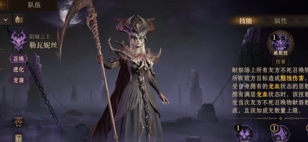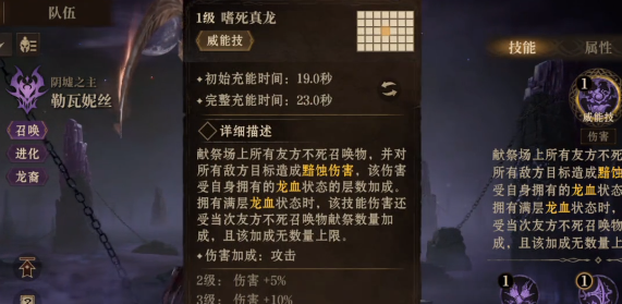 阴墟之主属于战斗技能,一开始时间为7秒,后期完整的时间为12秒。会将生命值最低的地方直接当成目标,可以给范围内的敌人造成200%以上的伤害。并且还会在目标周围去召唤死尸,在15秒内都会有效果,这个技能就会继续追加200%的伤害。