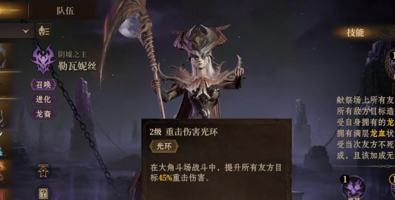 定位于传说级别的召唤英雄,一个队长技能就可以有效提升所有有方目标45%的伤害,被动技能龙神血脉可以减少自身30%的伤害。如果场上有任意一个目标死亡,那么自己就可以得到龙血状态,并且这一个状态在持续期间没有办法移除。可以获得1.5%的重击伤害。