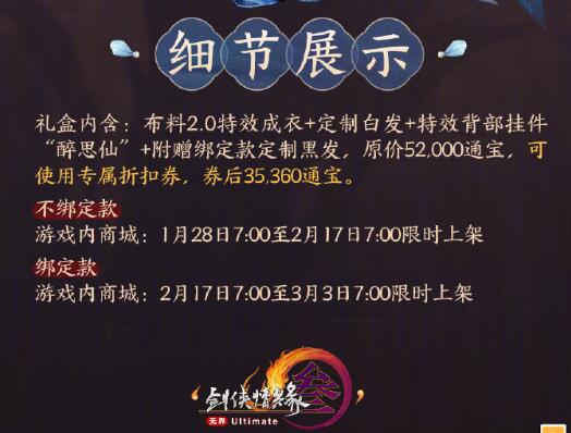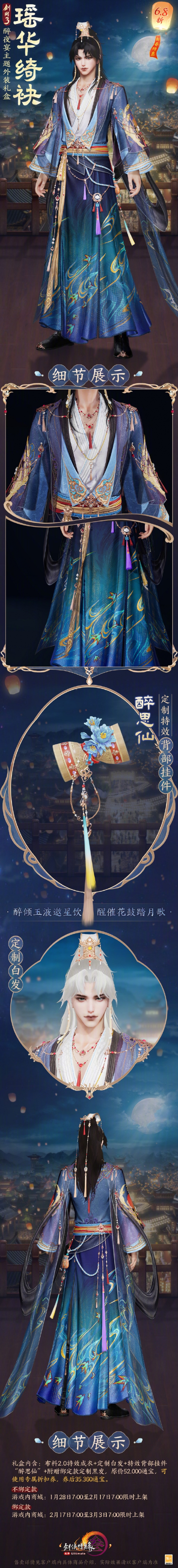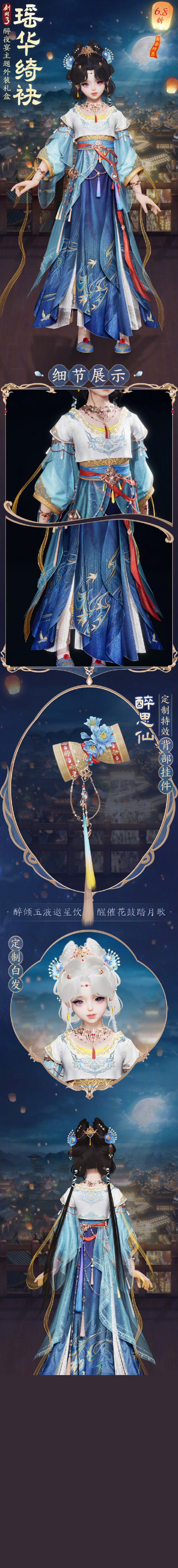 2、礼盒包含:布料2.0特效成衣+定制白发+特效背部挂件“醉思仙”+附赠绑定款定制黑发;