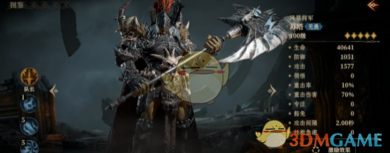 被动黑羽,每存活三秒钟,自身就能获得一层状态,持续时间无限,无法被移除,自身会根据攻击速度额外获得重击率,每一层状态能提升5%攻击速度。技能利爪,瞬移到当前血量最低的敌方目标,造成三次闪电伤害,视为普通攻击,在战斗开始时必定会释放。大招对范围内敌方目标造成闪电伤害,随后10秒内,友方目标对任意敌方目标进行普攻时,自身都有几率射出羽毛附加追加攻击,无畏英雄有双倍几率触发该效果,追加攻击同样被视为普通攻击。第4个推荐的是风暴将军苏塔,它的被动是对目标触发重击时,会产生幻影,幻影对目标发动追加攻击,追加攻击视为普通攻击。战技能斩甲劈砍,发动二连斩造成闪电伤害,有几率额外触发重击。大招巨力肢解,挥舞的大斧冲锋,对目标发动5次攻击。有额外几率触发重击,被该技能击杀的敌方目标无法被复活。