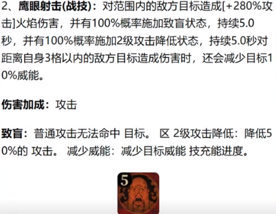 鹰眼射击属于一个战斗技能,可以给范围内的敌人全部都会造成280%的火焰伤害,而且还会有100%的几率出现一个致盲的状态,有100%的几率可以有效降低状态,可以持续5秒的时间。对于距离自身三个以内的敌人全部都会造成对应的伤害,而且还会降低目标,大概10%的技能进度。