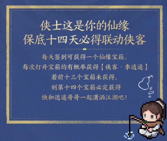 剑网3仙剑联动角色为李逍遥,那么该角色要怎么获得呢,活动期间登录游戏并签到都会获得一个【仙缘宝箱】,只要打开宝箱就有概率获得侠客【李逍遥】,签到14天必定获得。接下来就由小编给大家带来了详细的《剑网3》侠客李逍遥获得方法!