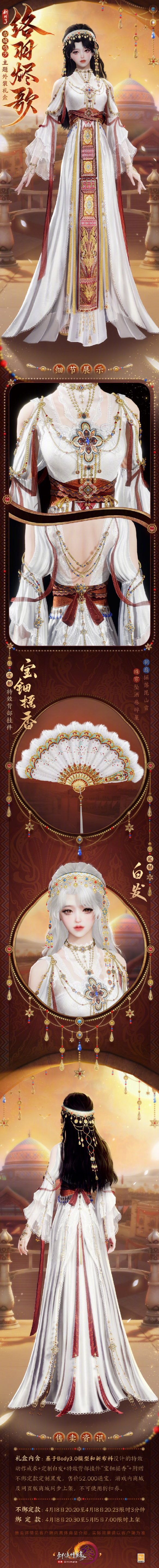 络羽烬歌是剑网3古城鸣沙主题时装,那么该时装长什么样呢,时装整体以白色为主,红色为辅色,再用少量的金色做点缀,礼盒还包含定制白发白发和特效背部挂件宝钿摇香,接下来就由小编给大家带来了详细的《剑网3》古城鸣沙主题外装络羽烬歌外观一览!