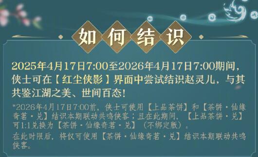 1、2025年4月17日7:00-2026年4月17日7:00期间赵灵儿会出现在【红尘侠影】里面;