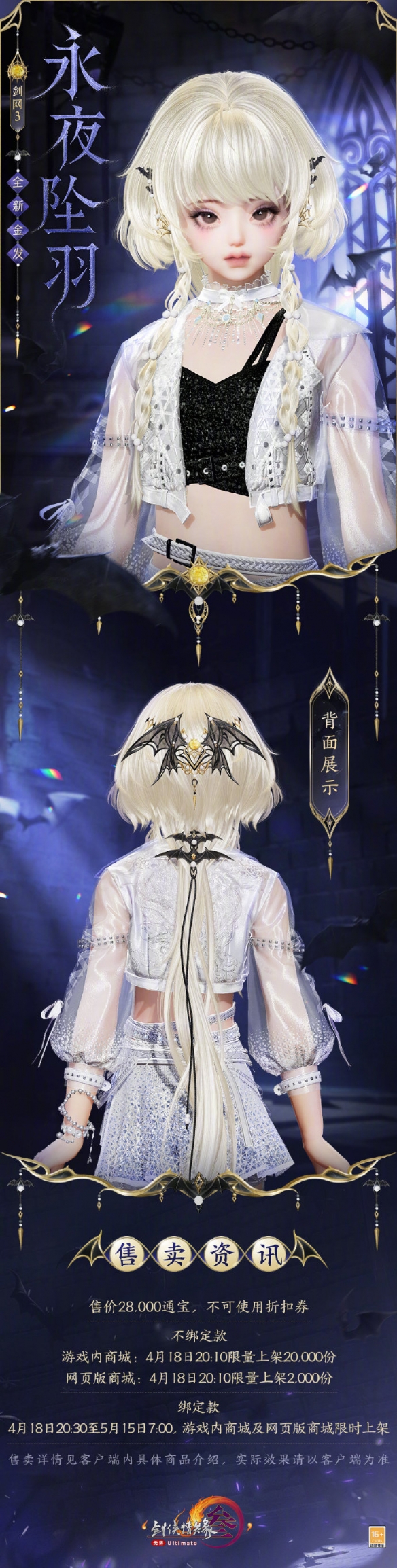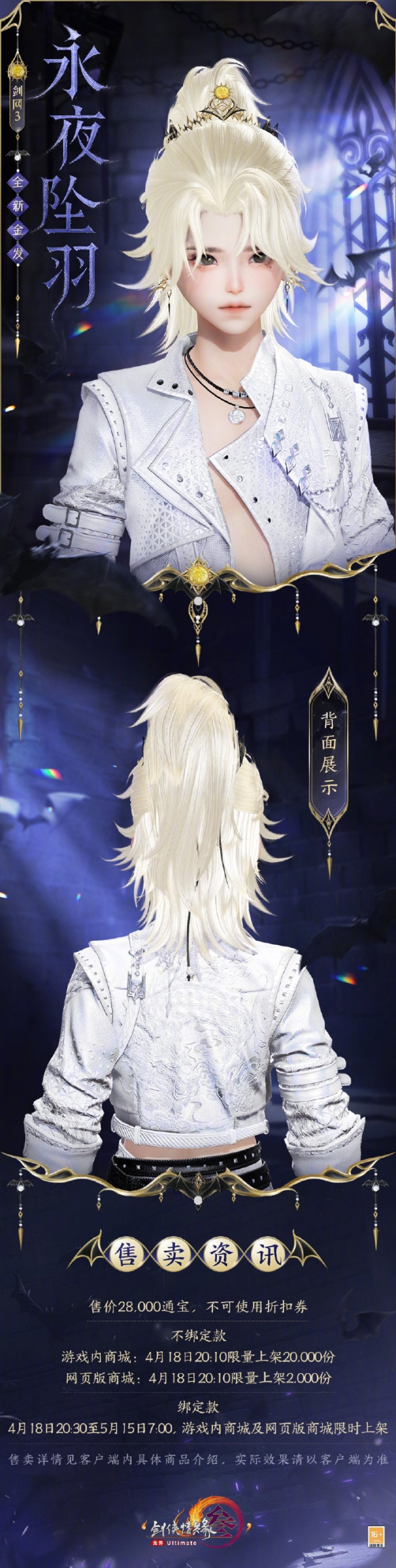 剑网3金发永夜坠羽将于4月18日上线,那么该发型长什么样呢,发型以蝙蝠双翼为灵感,背面有许多蝙蝠元素的挂饰,金发售价28000通宝,本次金发玩家不可使用折扣券,接下来就由小编给大家带来了详细的《剑网3》金发永夜坠羽外观一览!