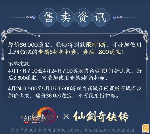 2、支持使用专属五折折扣券,4月24日7:00后将恢复原价售价36000通宝,不可使用折扣券;