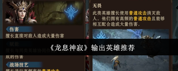 龙息神寂输出英雄怎么选?游戏中,每个英雄都有着各自不同的战斗方式,而这也将会导致他们发挥作用的关键不同,小伙伴们是否想知道在游戏里哪些英雄是比较值得培养的呢?那么或许今天的这期文章就能够帮助到你。