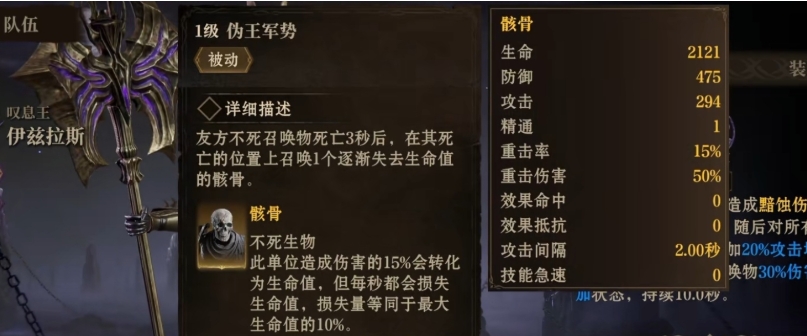 伊兹拉斯所拥有的队长技效果十分显著,当在战斗中使用这招后,能够提升所有友方目标30%的攻击力,而伪王军势则是他的被动技,有着独特的运作机制,当己方的不死召唤物死亡3秒后,在其死亡的位置上,会神奇地重新召唤1个逐渐失去生命值的骸骨,这些骸骨不死生物所造成的伤害,会按一定比例转化为生命值,这就像是它们在战斗中具备了自我恢复的能力,这类效果用来组成召唤流派队伍是最合适的。