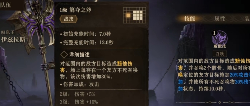 伊兹拉斯的战技叫做篡夺之斧,使用的时候爆发力属于各个技能挡住比较强的,暑促胡的时候能够控制的单位也比较多,属于一类范围伤害,在此范围之内的敌人不仅会受到伤害,还会被施加黯蚀元素,所以后续只要大家召唤的不死召唤物越多,使用技能的伤害就会增加20%,这意味着在有较多不死召唤物在场的情况下,战技的伤害会得到显著提升,具备极高的爆发输出潜力,在混战之中,释放这一技能往往能瞬间改变战局,也是带有一部分的影响机制的。