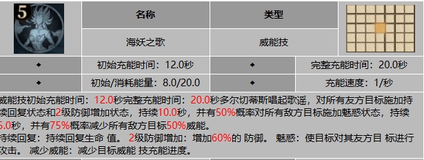 海妖之歌无疑是多尔切蒂斯最为强大的技能之一,使用时所有的友方目标都会获得持续回复状态和2级防御增加状态,这一效果能够持续10秒之久,持续回复状态就像是有一个无形的泉水在不断地为队友们补充生命值,让他们在战斗中能够保持良好的状态,而2级防御增加状态则能够增 60%的防御,使队友们的防御能力大幅提升,同时还有50%的概率对所有敌方目标施加魅惑状态,持续5秒。