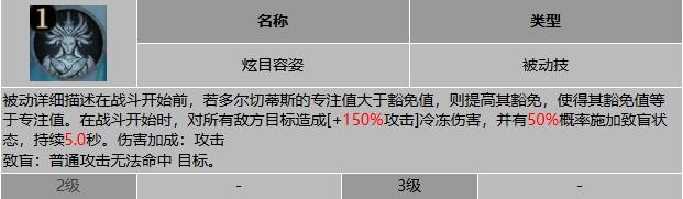 炫目容姿这一技能同样不容小觑,在对战即将拉开帷幕之前,如果多尔切蒂斯本体的专注值大于豁免值,那么她的豁免值将会得到提高,直至与专注值相等,这不仅增强了她自身的防御能力,更会对所有敌方目标造成相当于自身50%攻击的冷冻伤害,而且还有 50%的概率施加致盲状态,这个状态会持续5秒之久,一旦敌人陷入致盲状态,他们的普通攻击将无法命中目标。