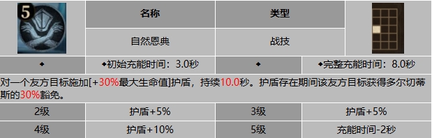 被控制的敌人只能盲目地挥舞着武器,却无法对队友造成有效的伤害,自然恩典则是一个专注于保护队友的技能,当她对一个友方目标施加这一技能时,会为其提供相当于自身30%最大生命值的护盾,并且这个护盾能够持续10秒,在这护盾存在期间,该友方目标还能获得多尔切蒂斯30%的豁免值,特别是在与高伤害敌人相遇时,自然恩典所提供的强大保护能够有效地减轻队友所承受的伤害,增强其生存能力。