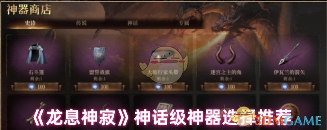 龙息神寂神话级神器怎么选,神器分类:神器一共四大类,史诗、传说、神话、及专属,专属只有特定的六个英雄分别对应使用。效果强力,对指定英雄提升十分明显,但兑换难度大,本篇为玩家介绍的是神话级神器的选择推荐,感兴趣的玩家可自行查看。