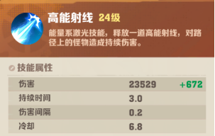能量系激光技能,释放一道高能射线, 对路径上的怪物造成持续伤害。