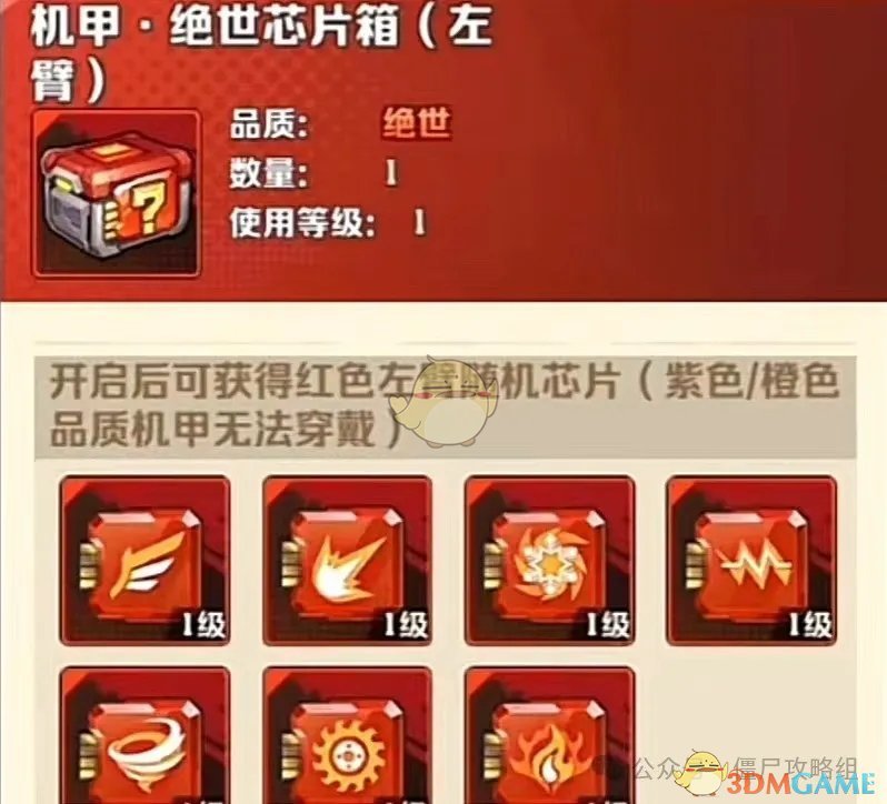 以上拿了之后,这次活动的自由之核是机甲的左臂的专属芯片,一件套它可以普攻时释放三道剑气,并且造成200%的能量伤害,如果是两件套的话自由飞剑的数量可以翻倍,而绝世芯片它跟技能是互相呼应的,打比方:风刃芯片,每升级一次制导激光机甲的伤害就可以提升5%,伤害会附带一次目标生命值1%的能量属性伤害。