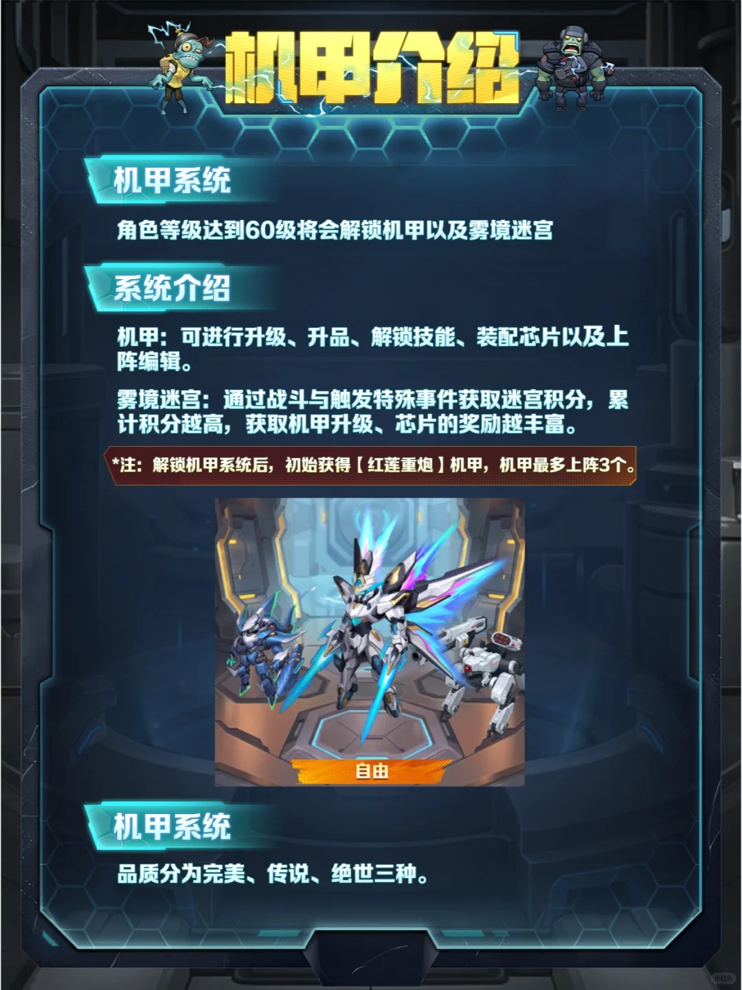 *注:解锁机甲系统后,初始获得【红莲重炮】机甲,机甲最多上阵3个。