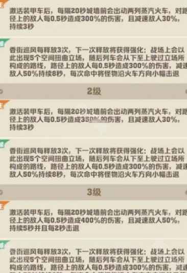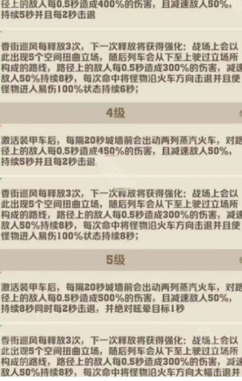 激活装甲车后,每隔20秒城墙前会出动两列蒸汽火车,对路径上的敌人每0.5秒造成300%的伤害,且减速敌人30%,持续3秒