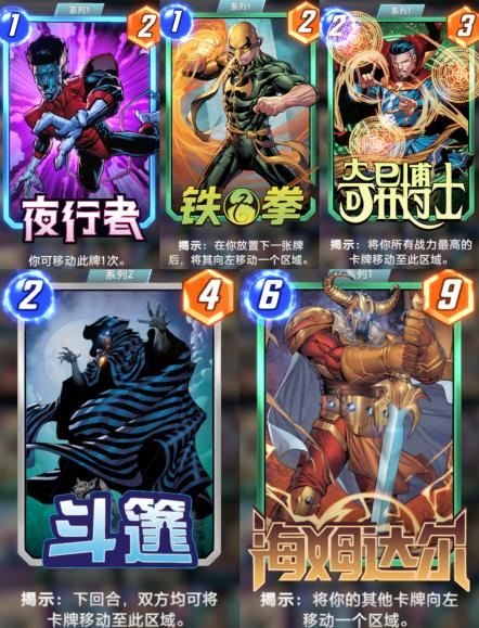 ②场上最高战力若有多张卡牌则奇异博士会将所有卡牌移动,若卡牌数量大于场地空余数则移动顺序为卡牌放置顺序