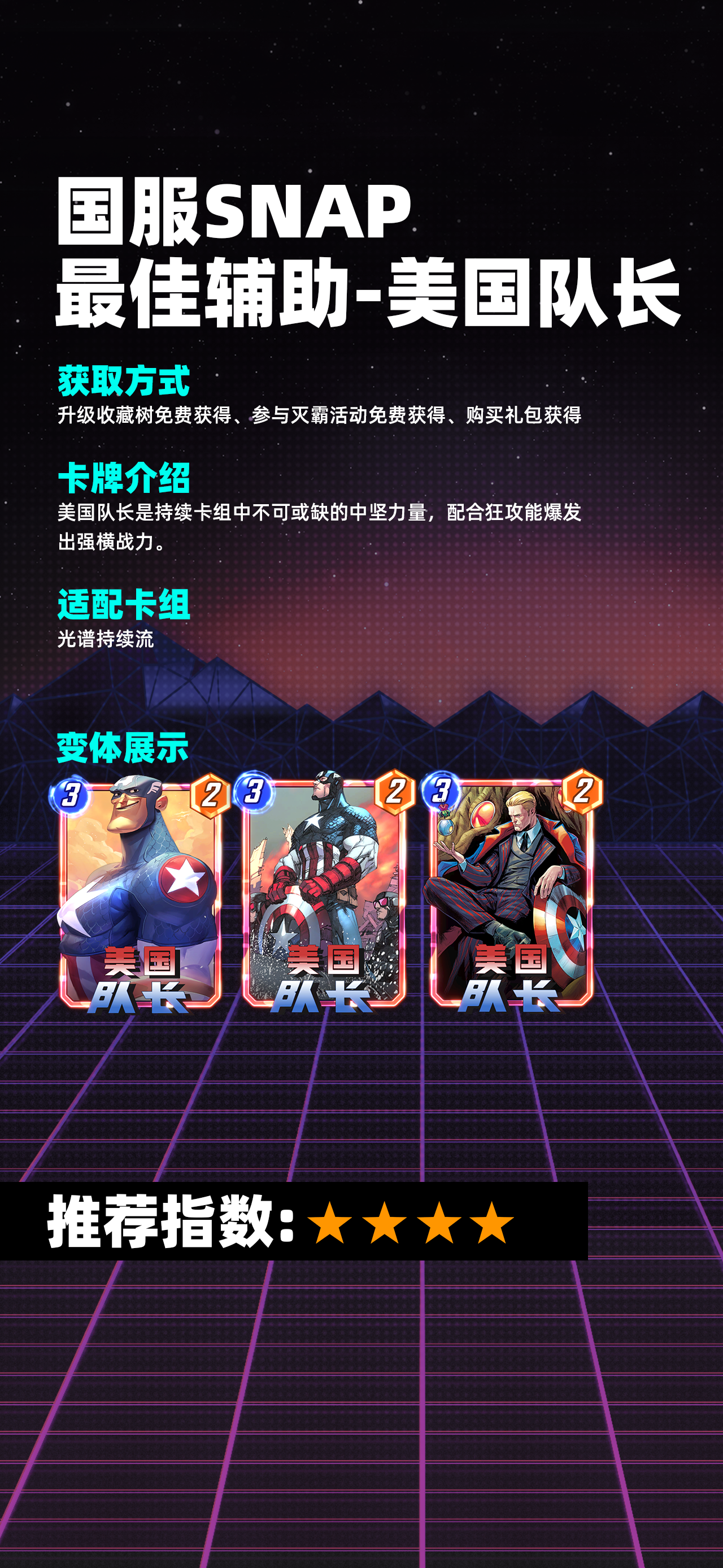 美国队长在漫威终极逆转游戏中,他拥有3-2的身材,能力上看也体现了原作中其强大的领导能力:持续:你在此牌所在区域的其他持续卡牌+2战力。较差的身材和一般的能力让该卡处于比较尴尬的地位,出了新手村后用的人不多,卡牌强度推荐指数:4分。接下来给大家带来了《漫威终极逆转》美国队长获取方法!