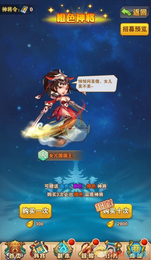 神将招募:这是一个属于土豪的活动,300元宝或神将令可参加招募抽奖1次。神将可分为:蓝、紫、橙等。抽10次以上,必出橙将;消耗2800元宝可连抽12次哦。不过新手玩家在前期领取游戏中奖励的元宝,就够一次十连抽的了,大家都可以体验的哦~