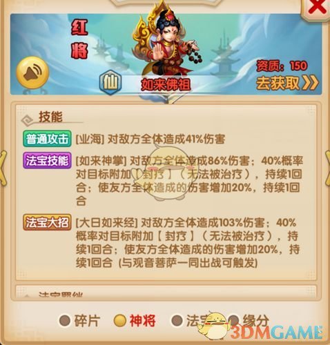法宝技能:【如来神掌】对敌方全体造成121%伤害;30%几率对没押镖附加【封疗】无法被治疗,持续1回合;使友方全体造成的伤害增加20%持续1回合。