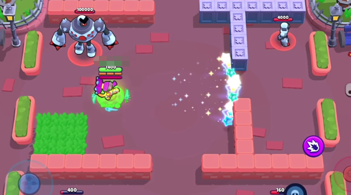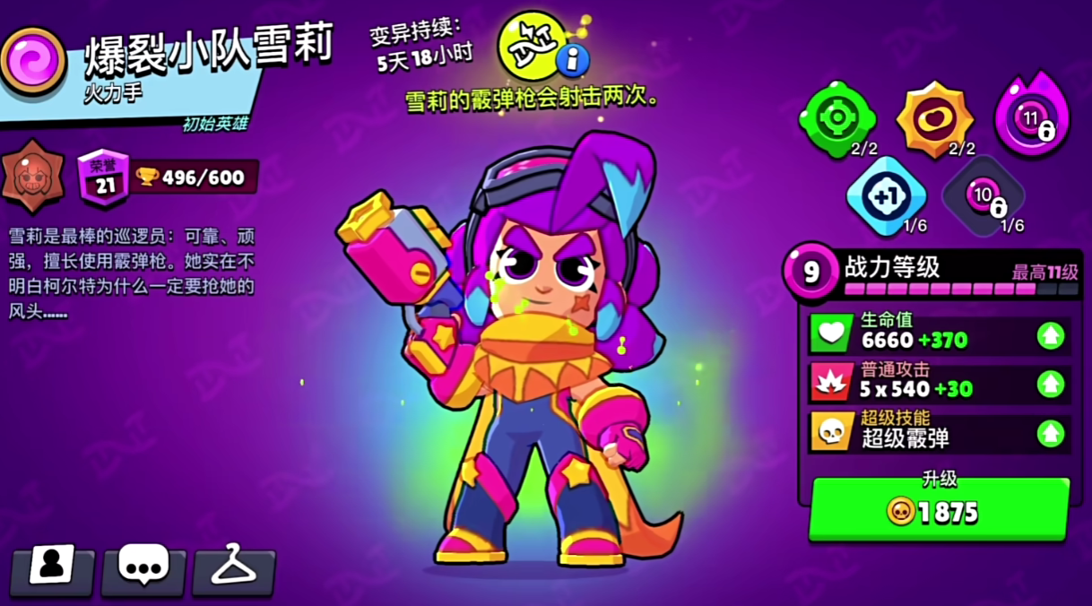 雪莉的第二个技能就是她的普通攻击技能,雪莉可以连续向前方目标发射两枚子弹,并且发射期间,子弹能量会进行一次存储,一旦达到了五层能量数值,雪莉就可以发射超级霰弹枪,在雪莉的星级升到三级时,普通攻击技能会变为发射四颗子弹。
