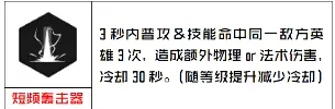短频轰击器:3秒内对同一个敌方英雄造成3次普攻or技能命中(跳一次伤害就算命中一次比如多段伤害的技能,多段伤害的普攻),对敌方造成一定物理或法术伤害,冷却时间30秒(随等级减少冷却时间)