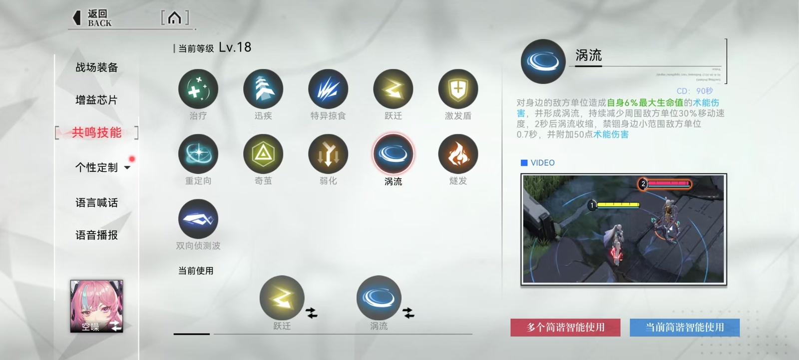 共鸣技能上跃迁属于必带的技能,另一个技能比较推荐带涡流,这样可以配合二技能打出连续的控制效果。并且涡流提供的减速效果,也能够让空噪更容易打满所有的技能伤害。