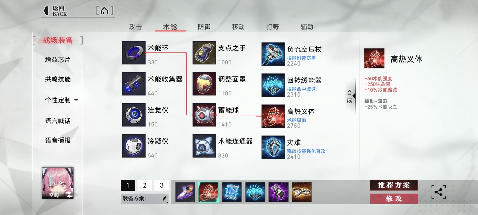 空噪除了被动技能外,其他三个技能都可以吃到术能的加成,所以想要提升输出,就要增加术能。但空噪又是一个上单英雄,不仅需要输出,还需要一定的坦度,所以法坦出装就是最好的选择。前期装备选择循环跑鞋和高热义体,冷却缩减、生命值、术能强度、术能吸血这些属性都非常契合空噪,尤其是25%的术能吸血,再加上空噪本身的被动护盾,让她可以拥有超强的持续作战能力。
