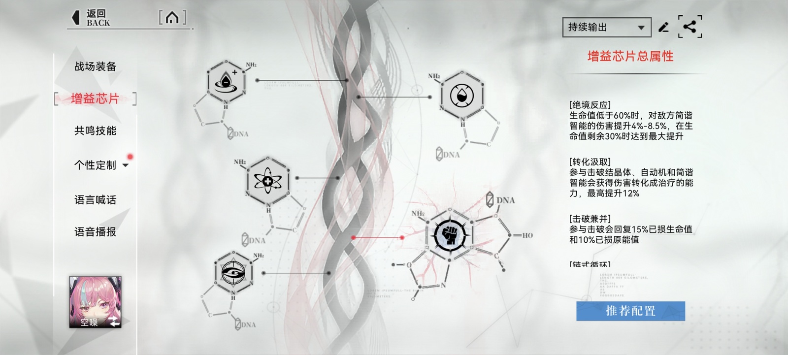 增益芯片则推荐一套个人比较喜欢用的搭配,链式循环、击破兼并、绝境反应、转化汲取和高热叠加,很暴力的一套增益芯片搭配,团战收割无解。