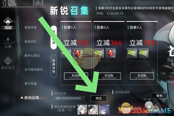 3、最后在新锐召集玩法中,找到绑定向导邀请码入口,输入邀请码点击绑定即可领取奖励;