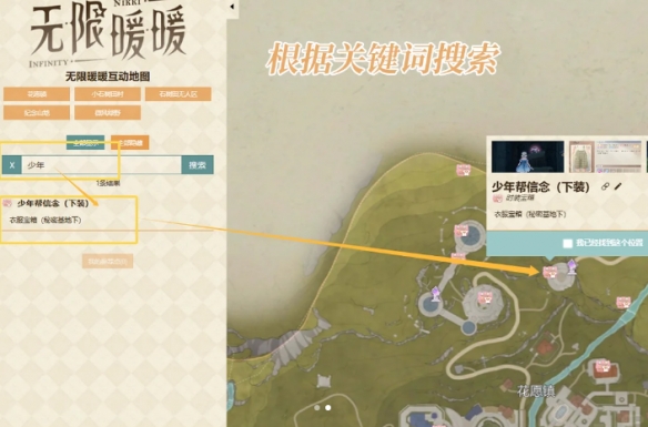 比如一件时装,显示来自于大世界宝箱获得。就可以通过关键词搜索快速定位到具体哪个时装宝箱。举例:有一件下装“少年帮的信念”来源于大世界的宝箱。在左侧搜索“少年帮”【支持部分关键词搜索】就可以看到相应的点位,点击以后就知道在地图的什么位置。
