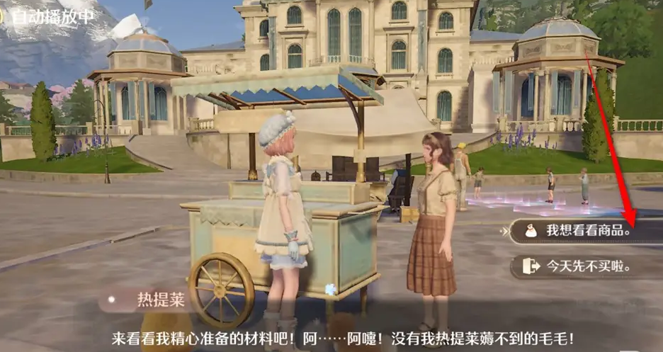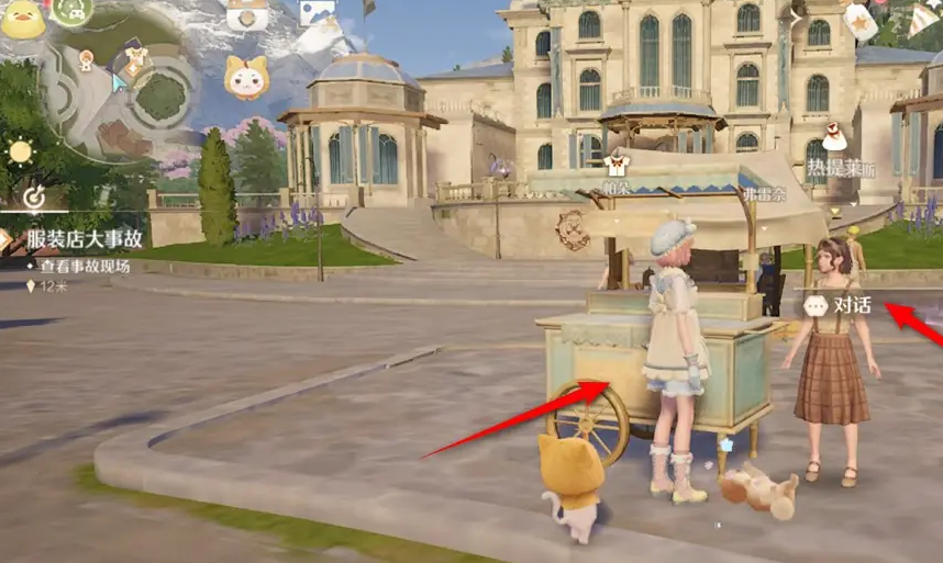 1、在无限暖暖手游,来到位于心愿镇的“热提莱”处,点击“对话”图标。