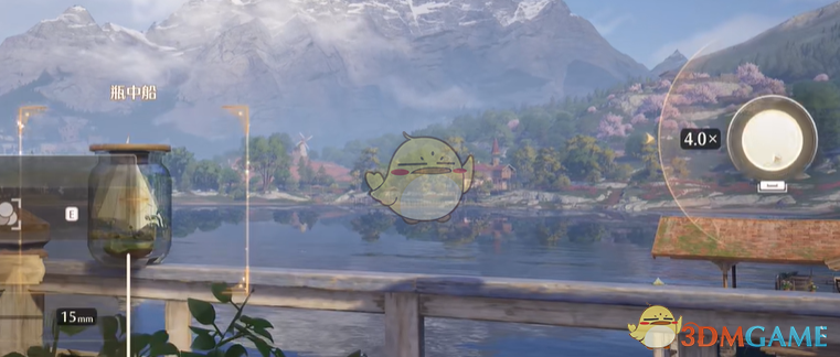 5、需要将瓶子和船挪到一条直线中,将倍率调到4倍,之后在左侧隐藏暖暖,移动视角点击右侧的拍照即可。