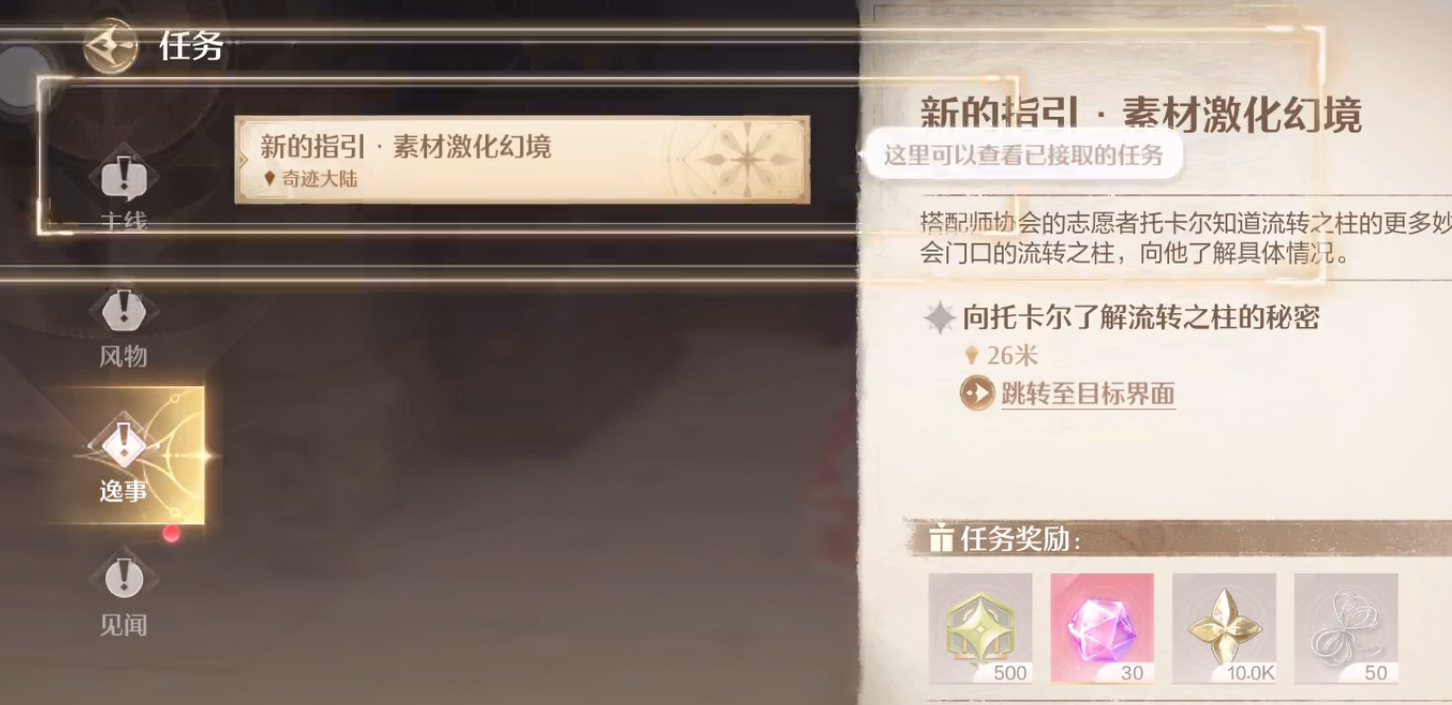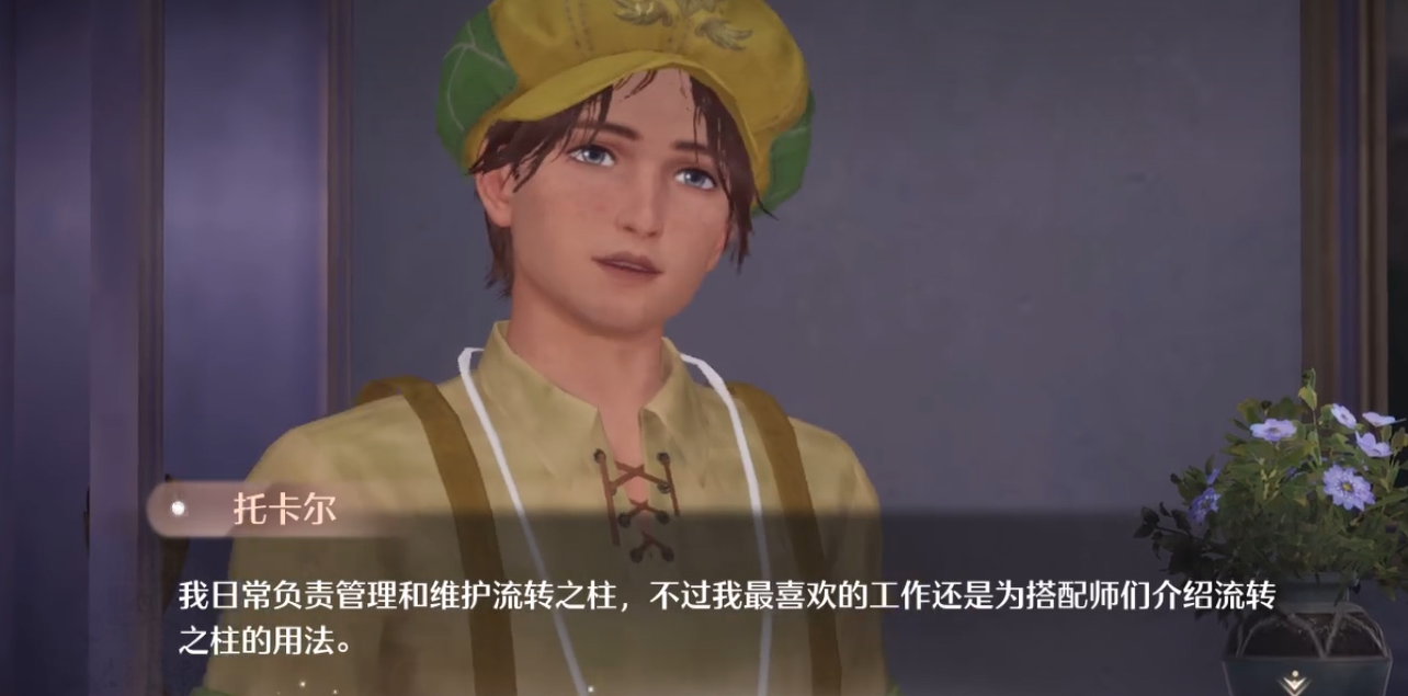 任务指引会让你走向搭配师协会,准备离开时,记得先去流转之柱处找托卡尔。这里的托卡尔会再次出现在你面前,继续与他进行对话。这时,托卡尔会提到流转之柱的神秘幻境,告诉你如何通过触发条件激活幻境挑战。