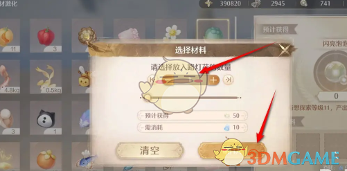 3、在素材激化页面右侧的位置点击闪亮泡泡,再选择一种素材,设置好放入的数量,点击确认。