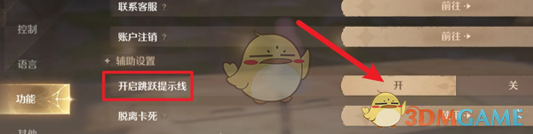 答:在游戏设置页面,找到功能选项,选择跳跃提示线点击开启即可。