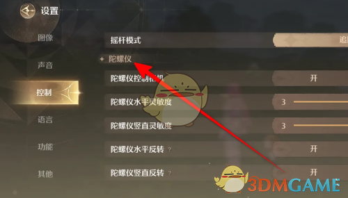 3、在左侧菜单功能页面下拉找到陀螺仪即可看到多项可调整的设置,找到灵敏度,点击三角形图标进行设置即可。