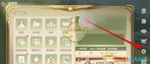 1、首先我们需要进入到游戏主界面,点击美鸭梨点击右侧设置图标进入。