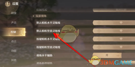 答:在设置页面点击默认相机竖直灵敏度进行设置。