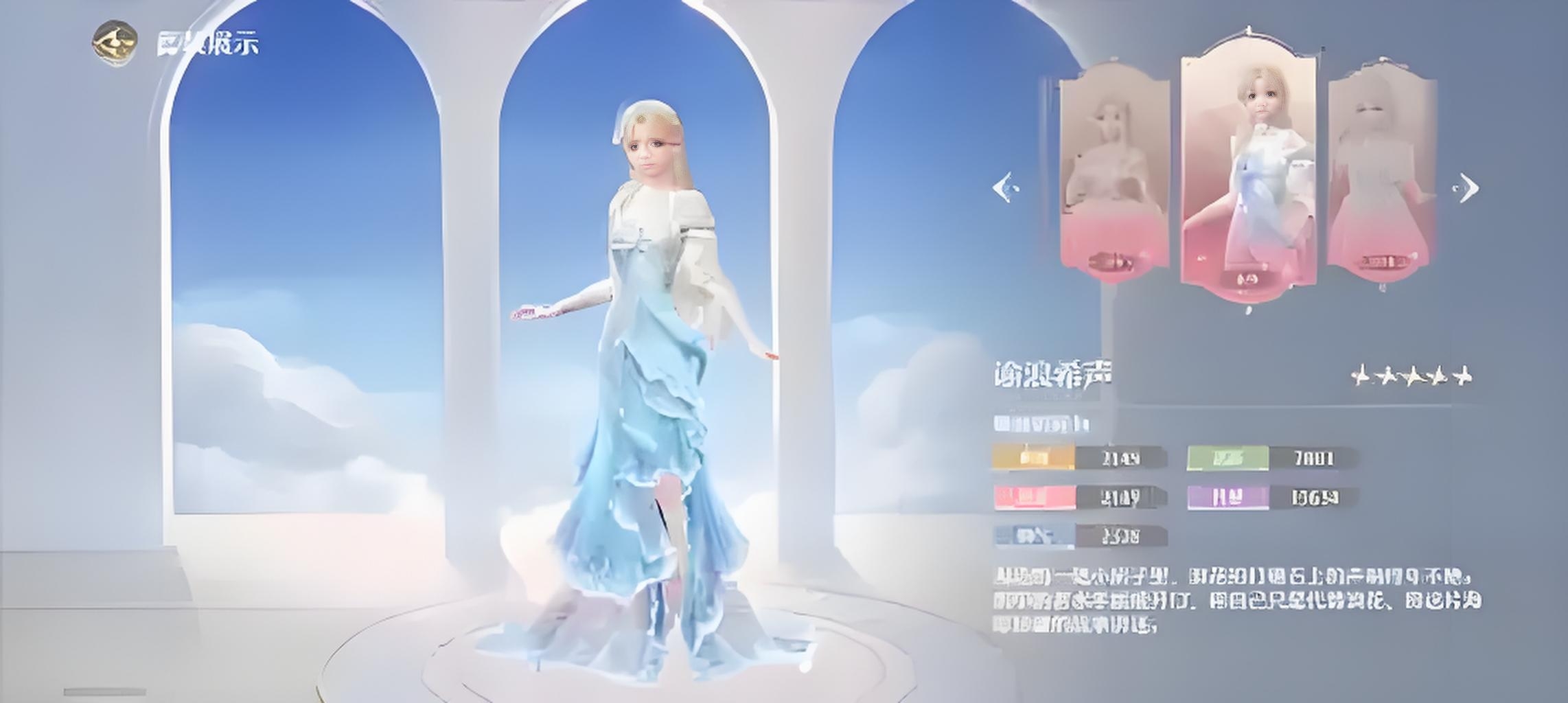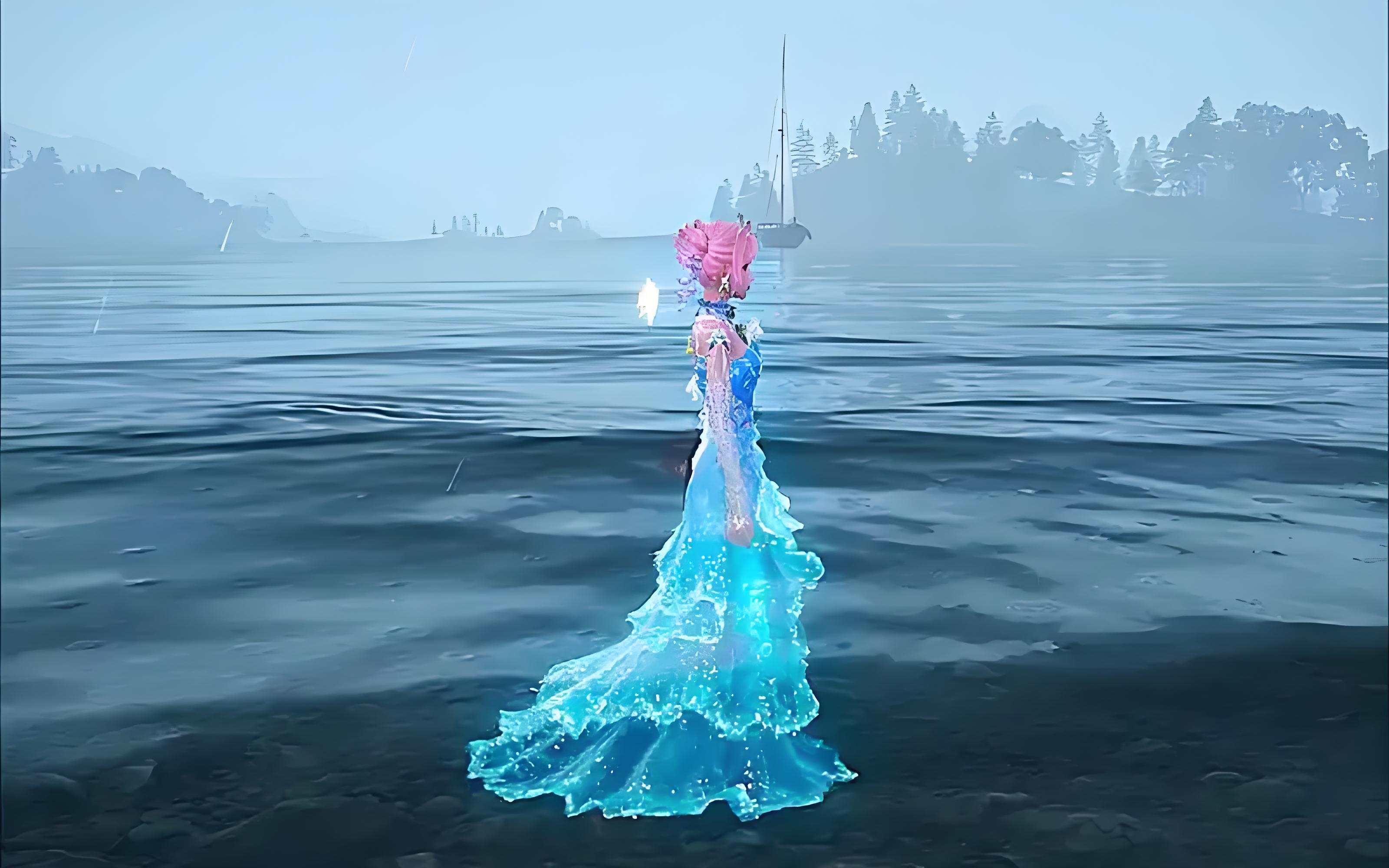 为了让大家更能清楚的了解套装,小编先从裙子的出场动画来给介绍,谕浪希声的出场动画设计的也十分出彩,模特穿着这套裙子犹如海的女儿一样缓慢的向你走来,走到跟前后还会向你优雅的挥挥手,之后手中就会自动出现一团泡沫,在镜头前全方位的展示完后。会在优雅的对你挥挥手,慢慢的离去。从整个出场动画来看,谕浪希声穿上之后显得人物更加的典雅高贵。