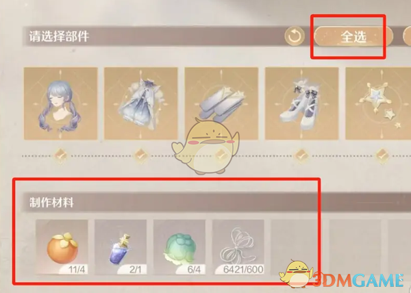 6、最后在部件选择中,点击全选,消耗材料即可完成制作;