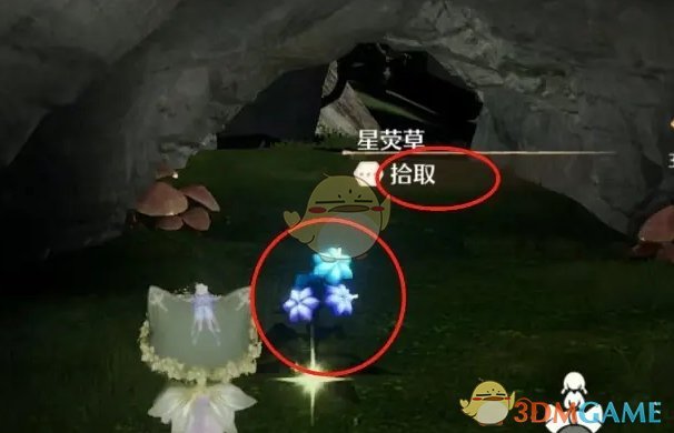 2、接着在祈愿森林的洞口处,找到星荧草后点击拾取;