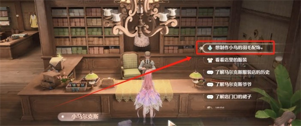 收集三个羽毛,任务提示更新,前往马尔克斯服装店。前往服装店,与马尔克斯对话,制作小鸟衣服。