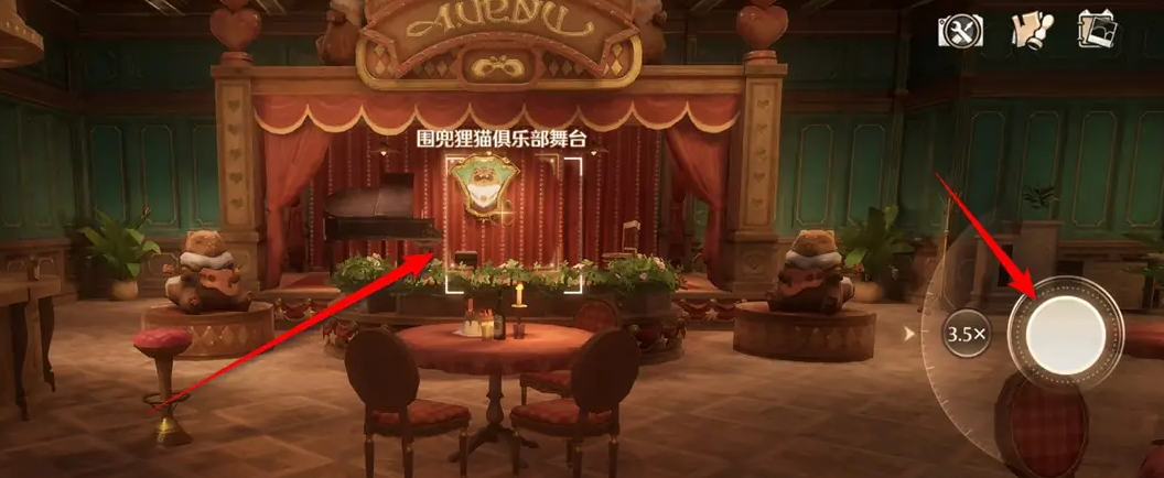 3、将相机对准舞台识别出“围兜狸猫俱乐部舞台”后,点按相机快门拍照。