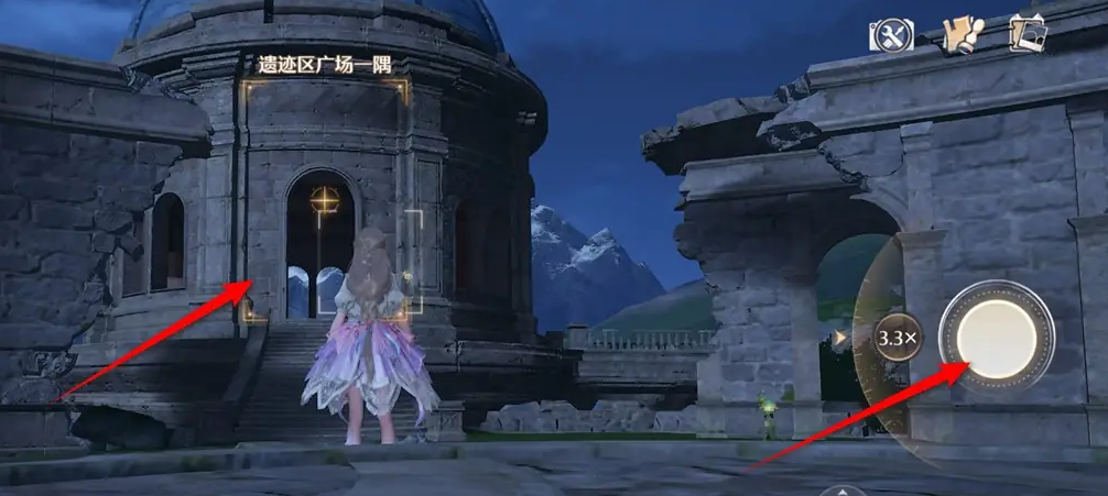 2、点击照相机图标,将相机对准遗迹区圆顶建筑并识别出“遗迹区广场一隅”后,点按相机快门。