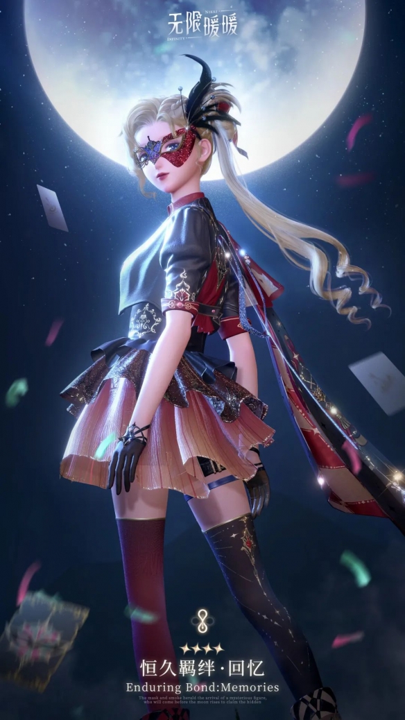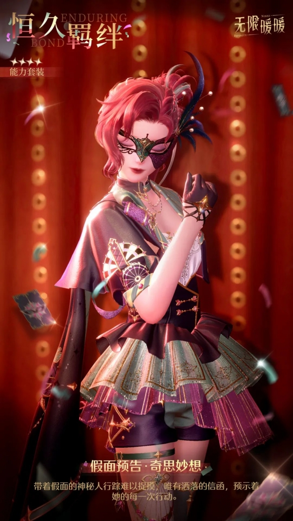 套装能力「假面预告·奇思妙想」:可在原地进行一场假面表演,带着假面的神秘人行踪难以捉摸,唯有洒落的信函,预示着她的每一次行动。