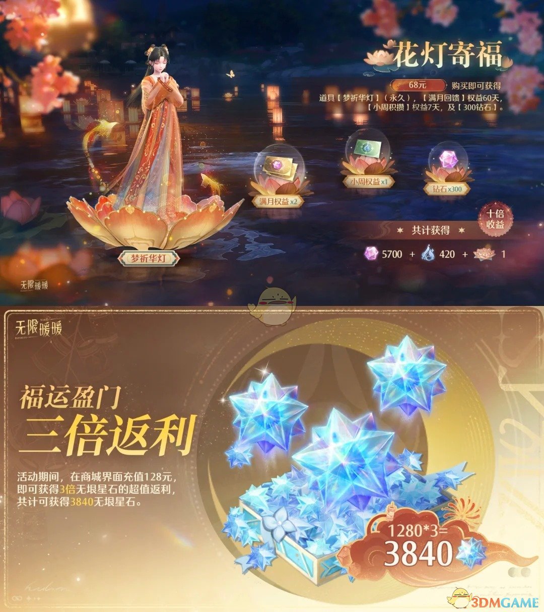奖励:道具【梦祈华灯】(永久) + 月卡60天 + 周卡7天 + 300钻石