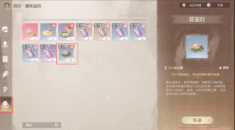 4、然后点击背包,最下面一个,点击花笼灯,装备